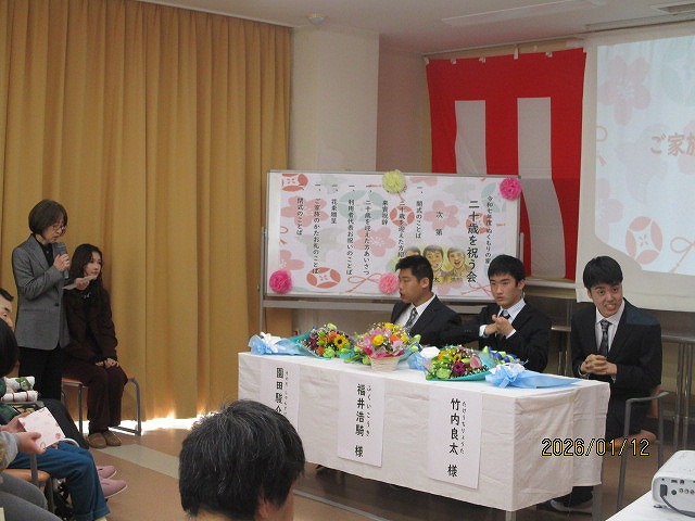 2026年1月12日 / 最終更新日 : 2026年1月14日 ぬくもり福祉会 ぬくもりの家 二十歳を祝う会 令和7年度に3名の方が二十歳を迎えられ、ぬくもりの家では穏やかな晴天に恵まれる中、二十歳を祝う会を無事開催することができました。 二十歳を迎えられた皆さまの笑顔に包まれ素晴らしい門出の一日となりました。 二十歳を迎えられた方、ご家族さま誠におめでとうございました。 FacebookXBluesky