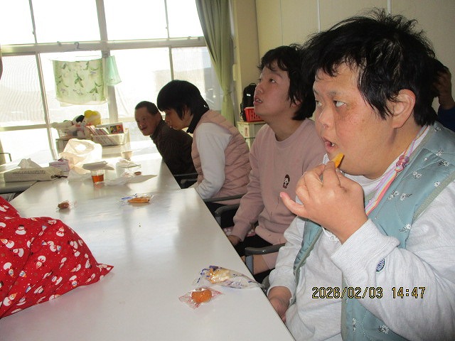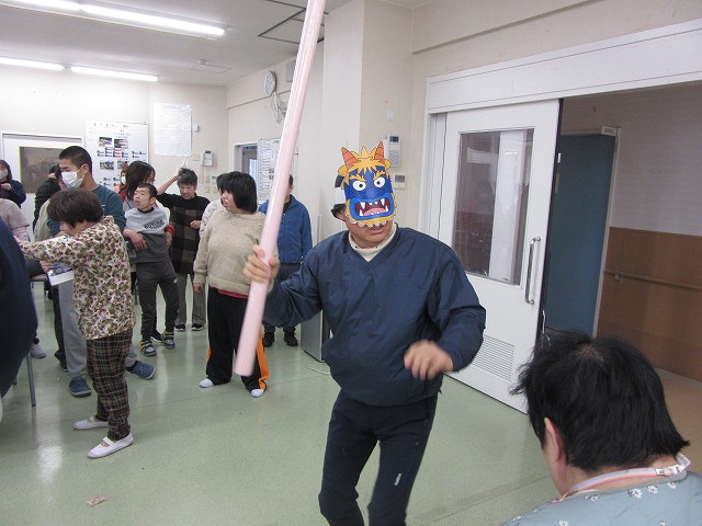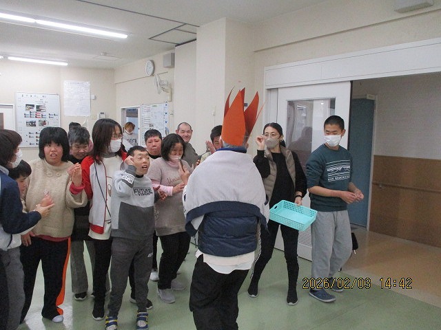 2026年2月3日 / 最終更新日 : 2026年2月7日 ぬくもり福祉会 ぬくもりの家 節分 2月3日ということでぬくもりの家でもまめまきを行いました。 支援者が鬼に扮して登場すると利用者さんからは「わ~」や「きゃ~」などの歓声(悲鳴?)が上がりました。 手に持っていた豆を鬼に投げて邪気払いを行いました。 お茶の時間に少しのおやつと豆を食べて無病息災を祈りました。 FacebookXBluesky