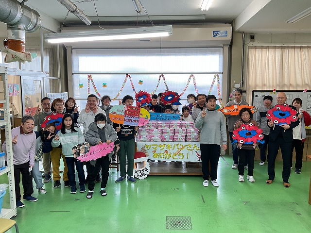 今年もヤマザキ製パン従業員組合安城支部様からたくさんのクリスマスケーキをいただき、令和7年の話題満載のネタで記念写真!